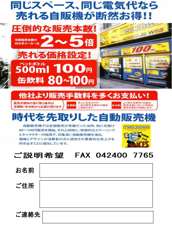 2009/08/07産経新聞夕刊にて「100自販機首都へ攻勢」-【定価販売の5倍増】と題しツーダウンが掲載されました
